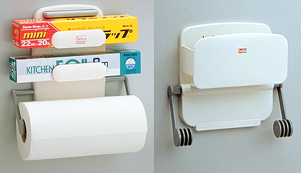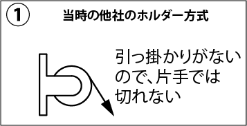 当時は今のようにボックス型のキッチンペーパーは売られておらず、ロール型が主流で他社のホルダーは基本的に①図のような保持方法だったため、ミシン目で切るには両手を使う必要がありました。